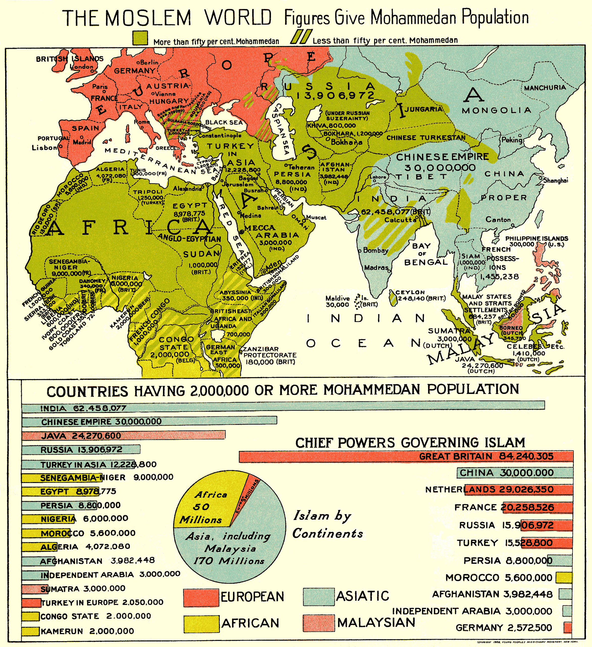 Este mapa foi extraído do livro “The Moslem World”, do missionário protestante americano Samuel Zwemer, Movimento de Estudantes Voluntários para Missões Estrangeiras, Editora da Igreja Metodista Unida, Sul, 1908. Ele mostra a conceituação do Mundo Muçulmano como uma unidade geopolítica, apesar da consciência de que as sociedades muçulmanas eram governadas por vários impérios, principalmente europeus.