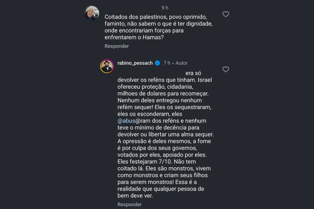 SILVA, Junio; MARTINS, Jonatas. Rabino brasileiro acusa palestinos de “viverem como monstros”. Metrópoles, 23 mai. 2025. Disponível em: https://www.metropoles.com/brasil/rabino-brasileiro-acusa-palestinos-de-viverem-como-monstros. Acesso em: 09/04/2026.