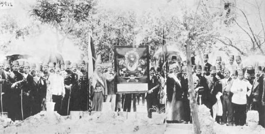 Cerimônia oficial em Jerusalém, agosto de 1908, com a presença de elites muçulmanas, judaicas e cristãs da cidade. Fonte (p. 44).