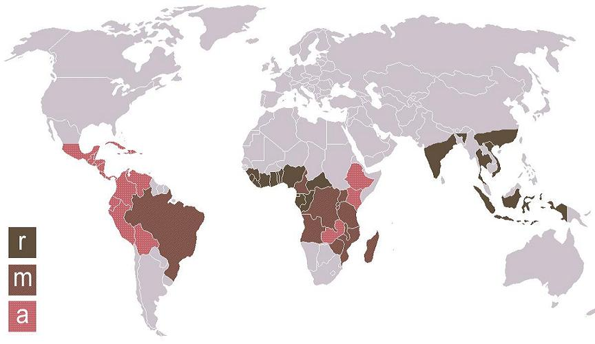 Figura 1: Distribuição geográfica da produção dos diferentes tipos de café (r: robusta, a: arábica, m: robusta e arábica).