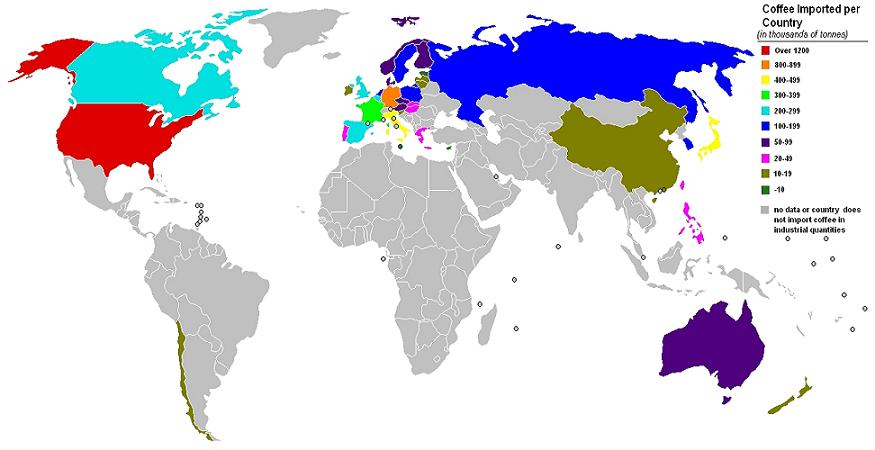 Figura 2: Mapa mundial baseado na importação de café por país em 2006, mostrando as importações brutas. Alguns países reexportam parcelas significativas do café importado. Baseado nas estatísticas da Organização Internacional do Café.