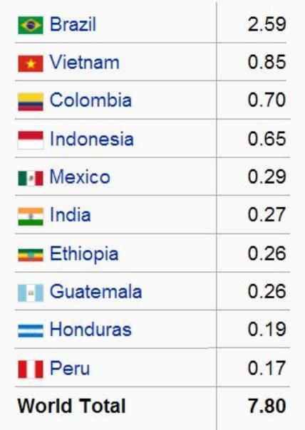Figura 3: Tabela dos dez maiores países produtores de café verde em 2006 (em milhões de toneladas métricas). Fonte: Organização das Nações Unidas para a Alimentação e a Agricultura (FAO).