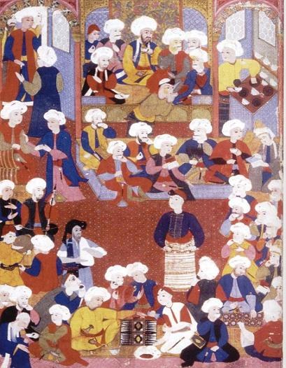 Figura 5: Manuscrito do século XVI mostrando uma cafeteria com homens bebendo café. Reproduzido em parte em 1001 Inventions: Muslim Heritage in Our World, editor-chefe Prof. Salim T. S. Al-Hassani (Manchester, FSTC, 2006, p. 13).
