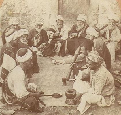 Figura 7a-b: Fotos de café da Palestina do início do século XX: (a) Uma cafeteria na Palestina por volta de 1900; (b) O método tradicional de moagem de café na Palestina por volta de 1905.
