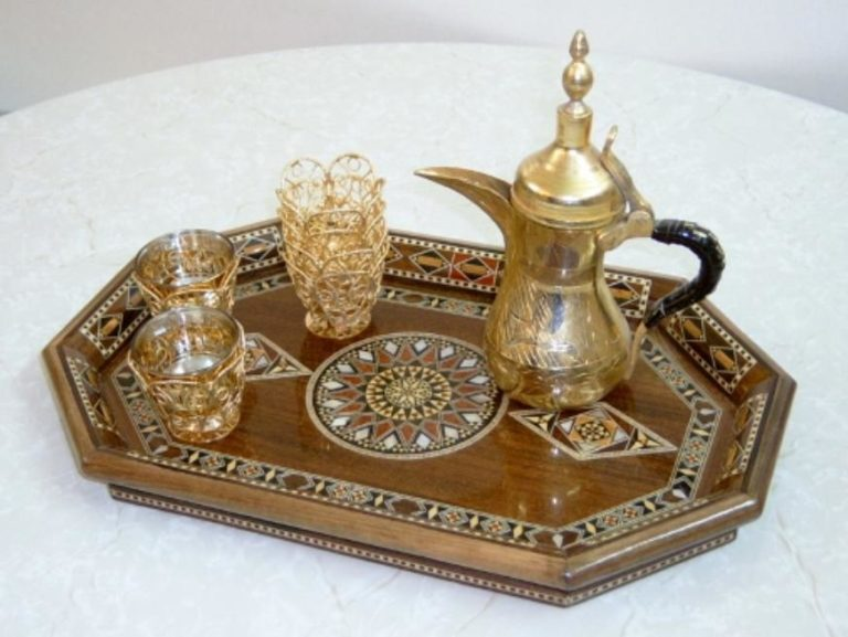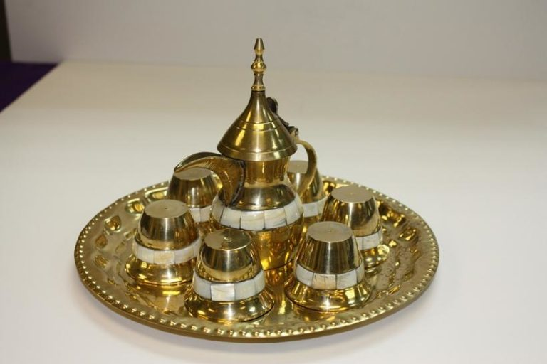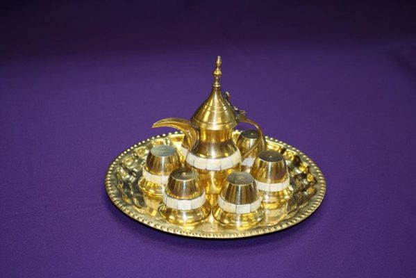 Figura 9a-c: Três conjuntos de café árabes e turcos diferentes, incluindo bules, xícaras e bandejas decoradas.