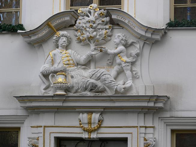 Figura 12: Relevo do pé de café sobre a porta de um café em Leipzig, mostrando uma representação escultural de um homem vestido com roupas de estilo turco recebendo uma xícara de café de um menino. O homem está sentado em frente a um pé de café. Café und Museum “Zum arabischen Coffe Baum”, Leipzig, Relief über dem Eingang. Foto tirada em dezembro de 2007 por Andreas Praefcke.