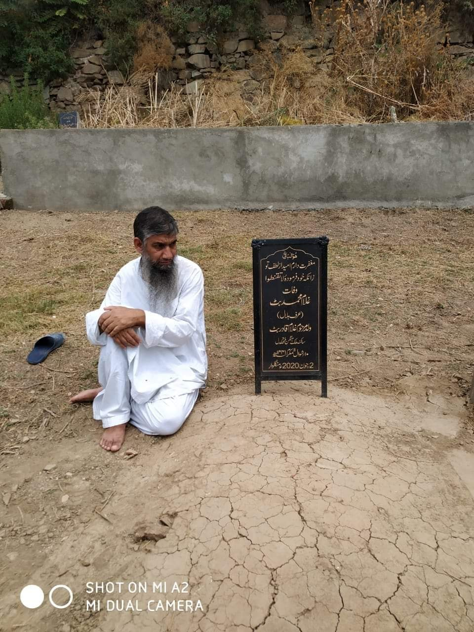 Shakeel ao lado do túmulo de seu irmão em 2019.